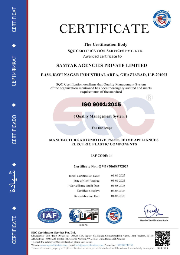At Samyak Agencies, we are committed to delivering high-quality plastic components that consistently meet or exceed customer expectations in the automotive, home appliance, and electrical sectors. Our quality objectives are guided by the principles of customer satisfaction, continuous improvement, and compliance with statutory and regulatory requirements. We shall achieve this by:
